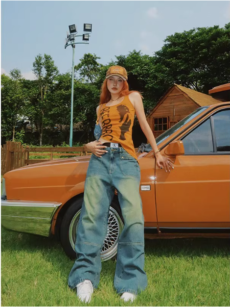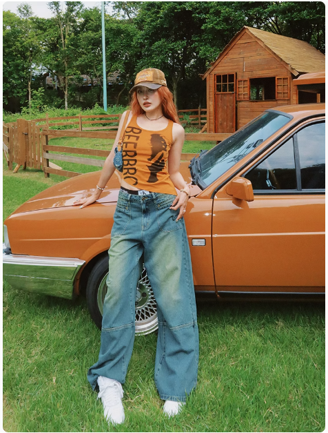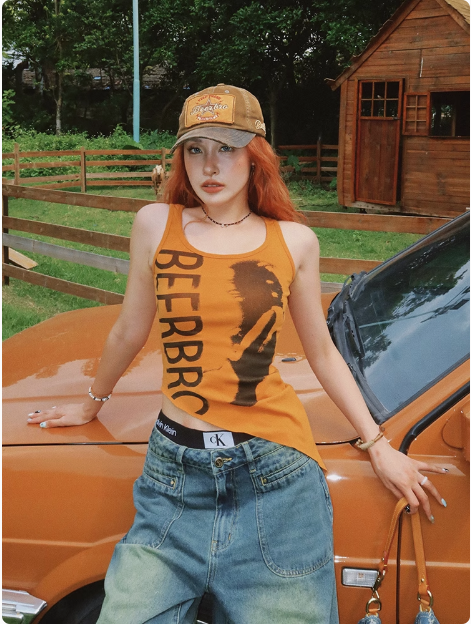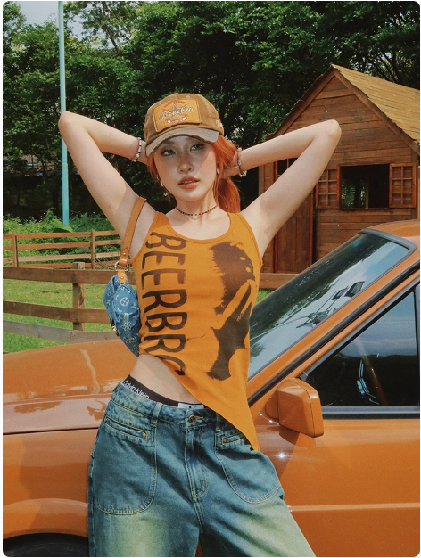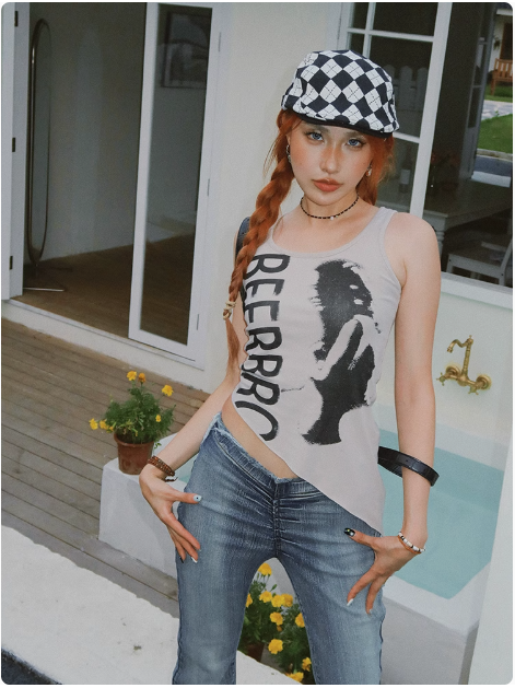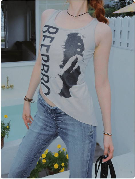 不規則下襬辣妹背心女夏季美式復古像印花無袖小上衣