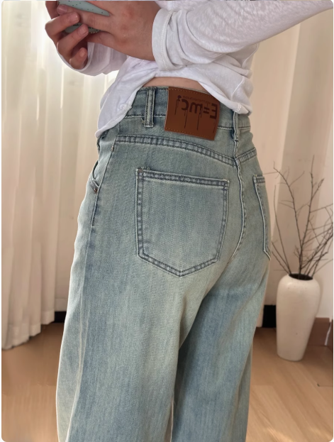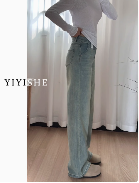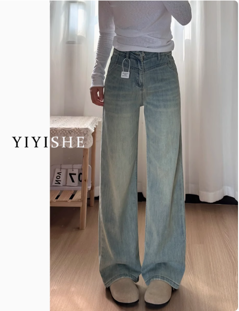 复古蓝阔腿牛仔裤女春季新款高腰设计感显瘦垂感宽松直筒裤子