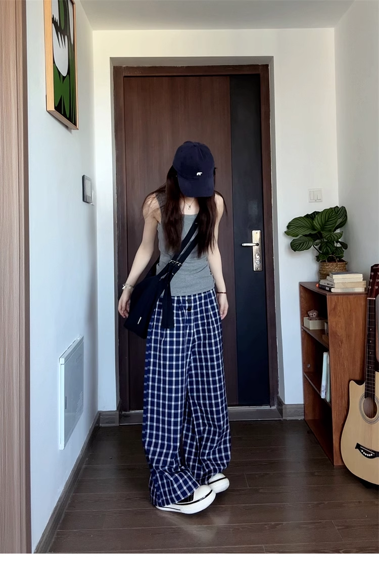 復古藍色格子休閒褲女春秋新款高腰垂感直筒拖地闊腿長褲夏季