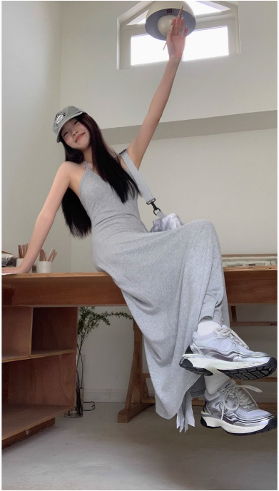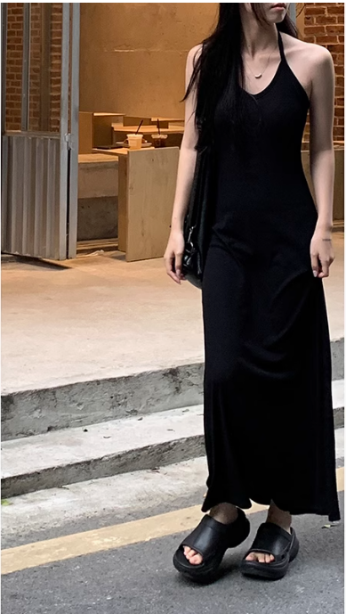 掛脖連衣裙女夏季新款黑色高級垂墜感長裙氣質超火吊帶裙子