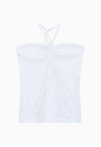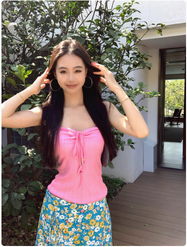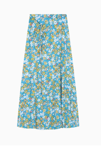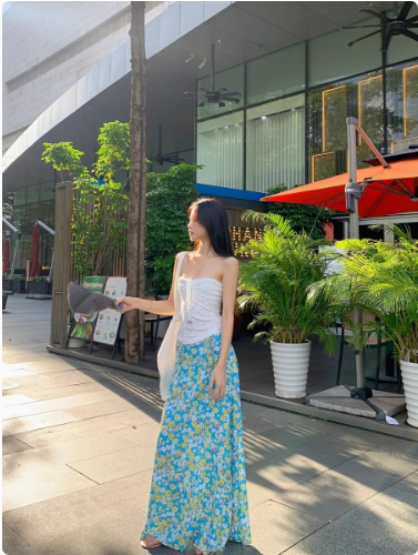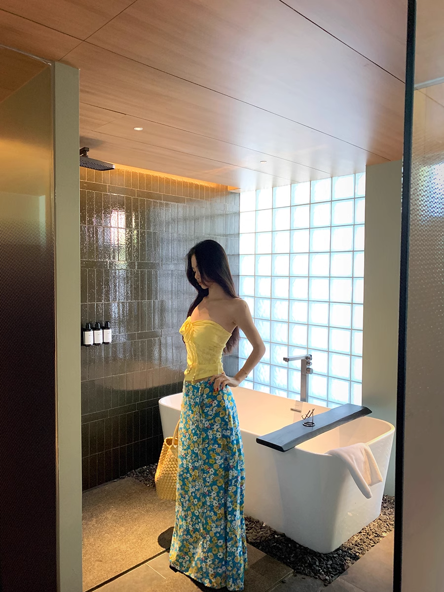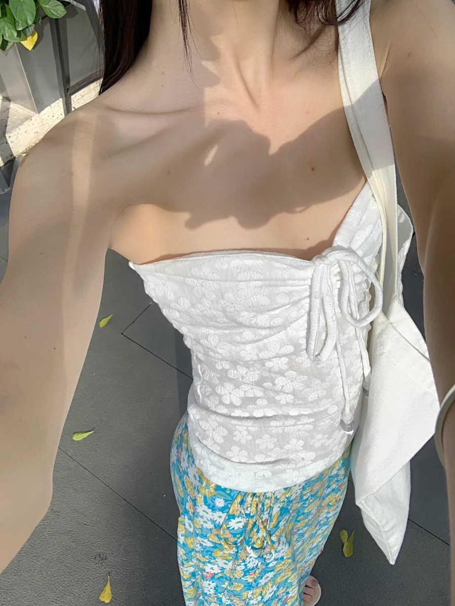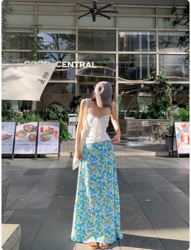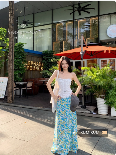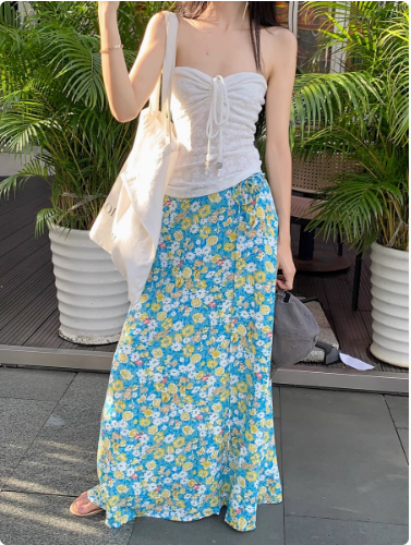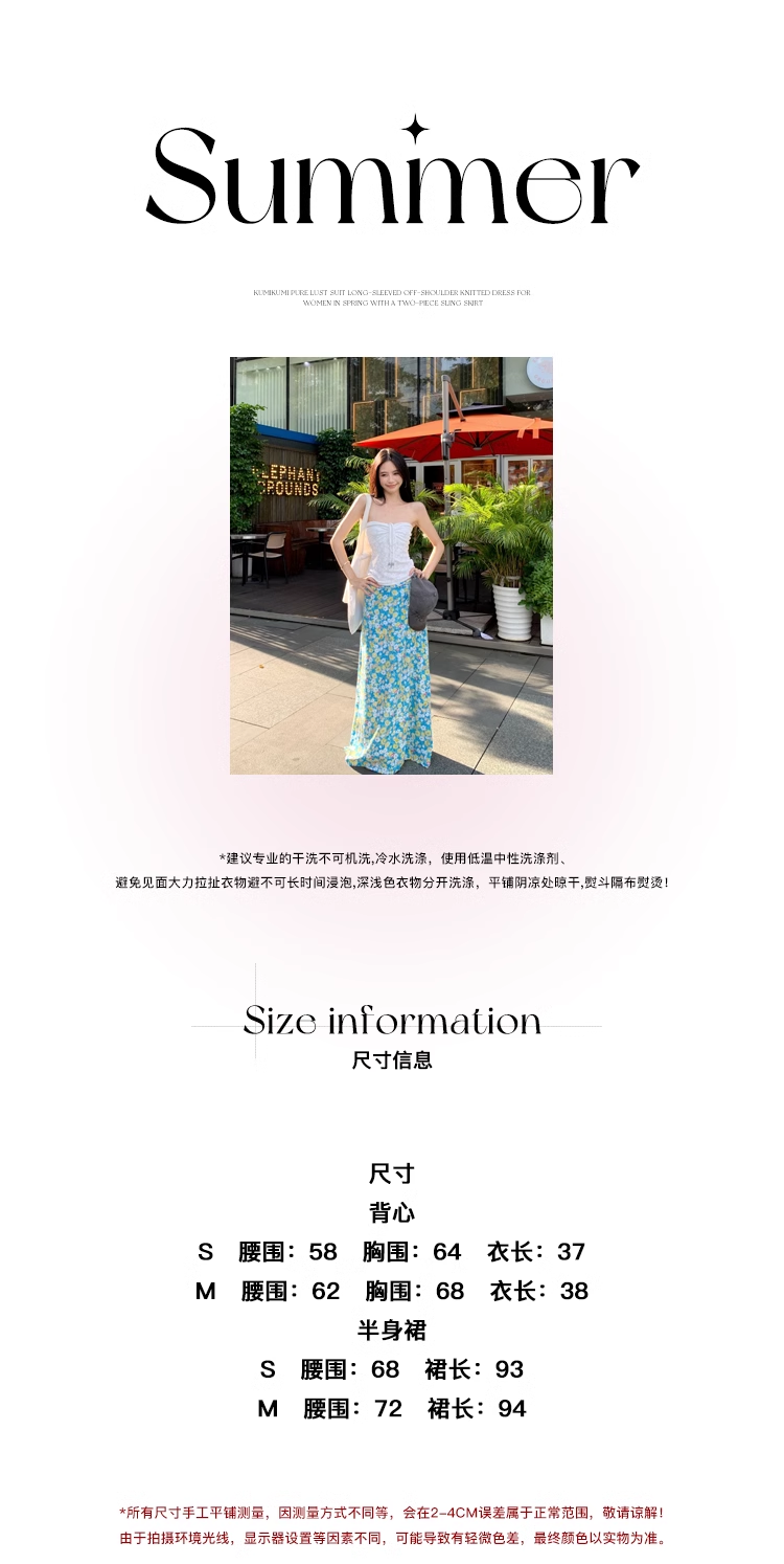 海邊度假風套裝法式抽繩抹胸背心上衣女夏季藍色碎花半身裙兩件套