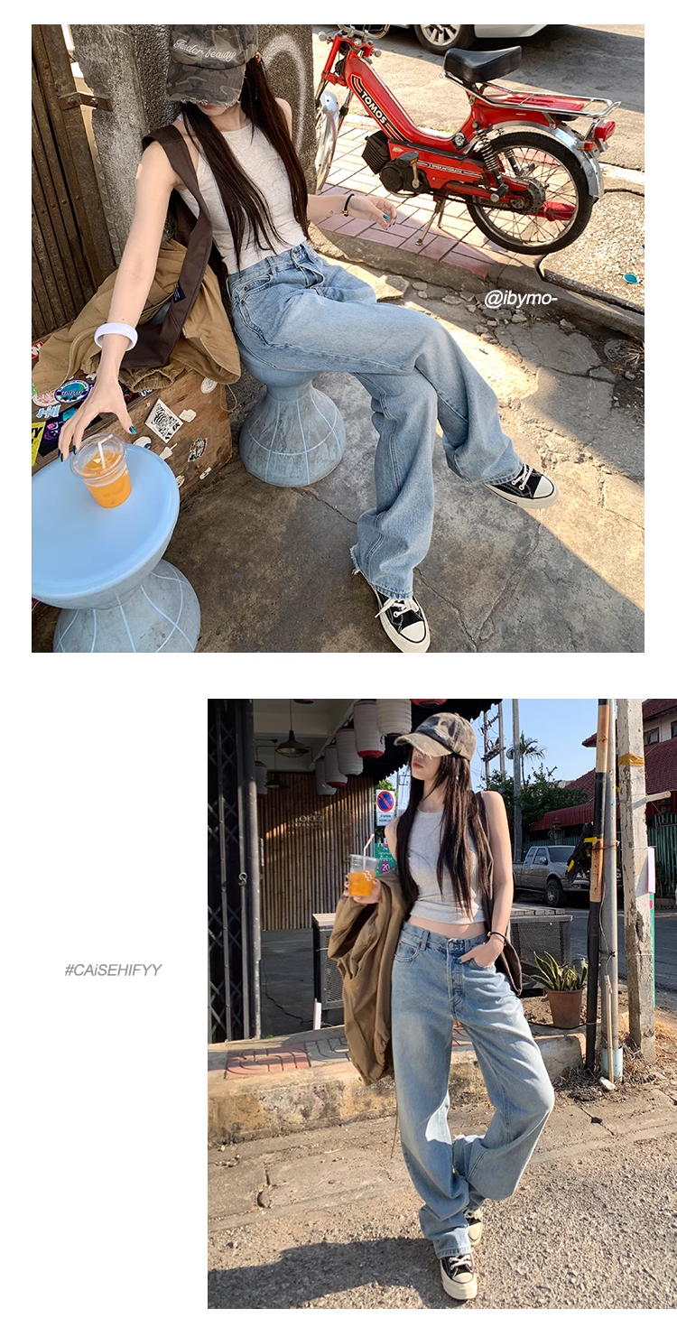 淺藍色直筒牛仔褲女春夏新款美式辣妹顯瘦百搭窄版寬鬆褲子