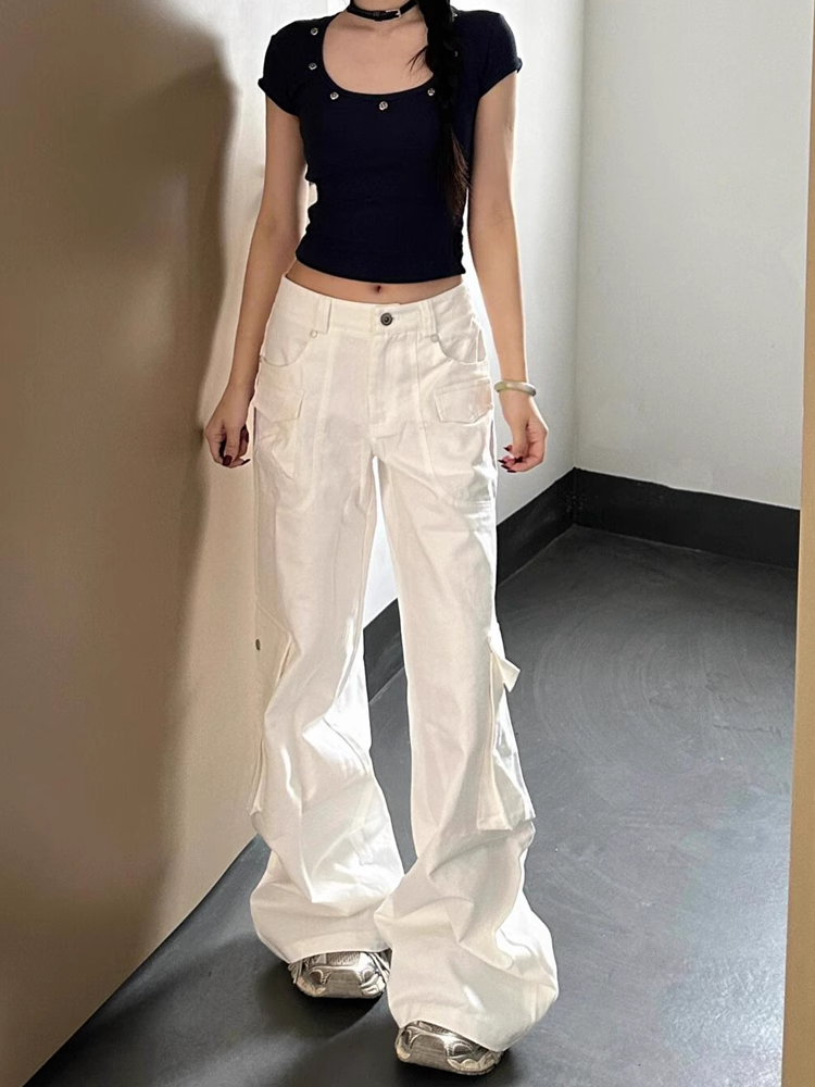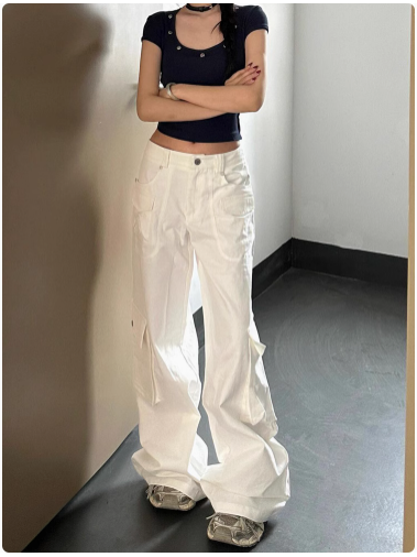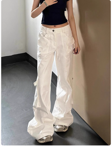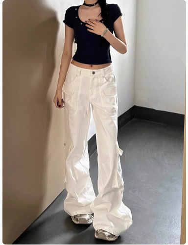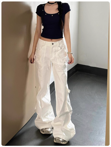 白色多口袋工裝褲女夏季新款美式高街辣妹直筒寬鬆闊腿休閒長褲子
