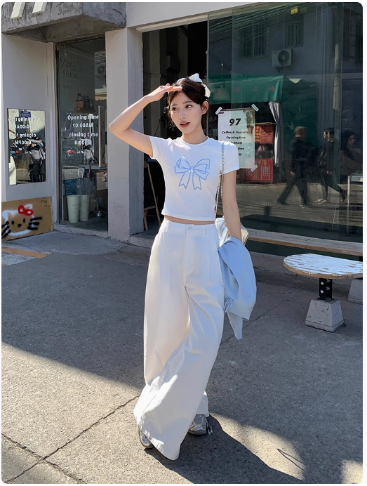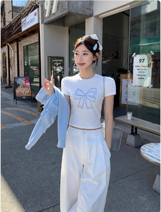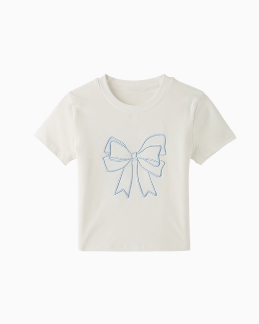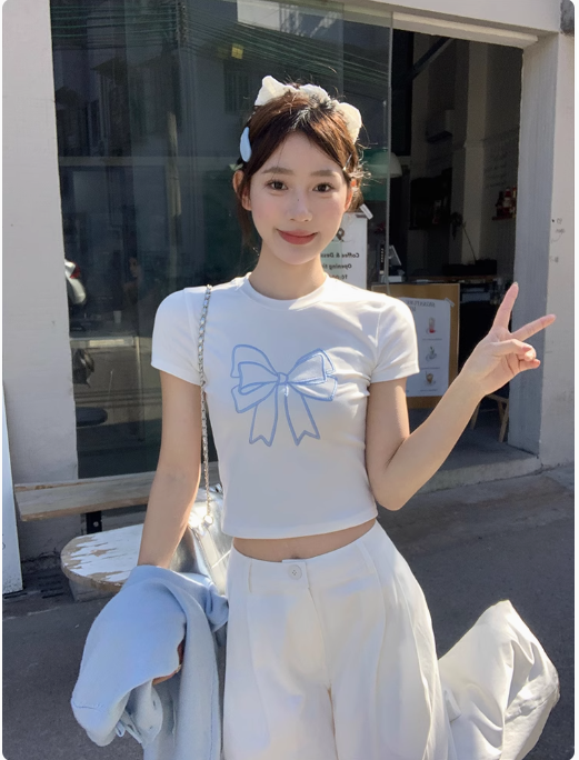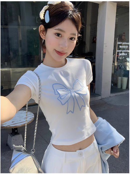 蝴蝶結繡花白色正肩短袖t恤女夏季修身顯瘦甜辣短款小上衣