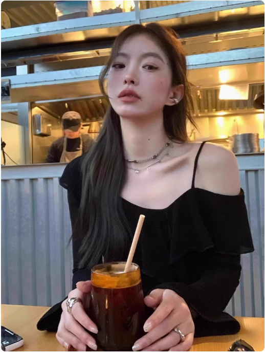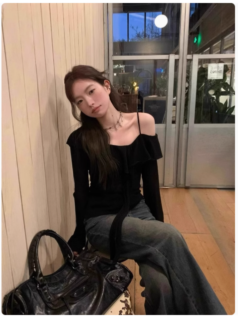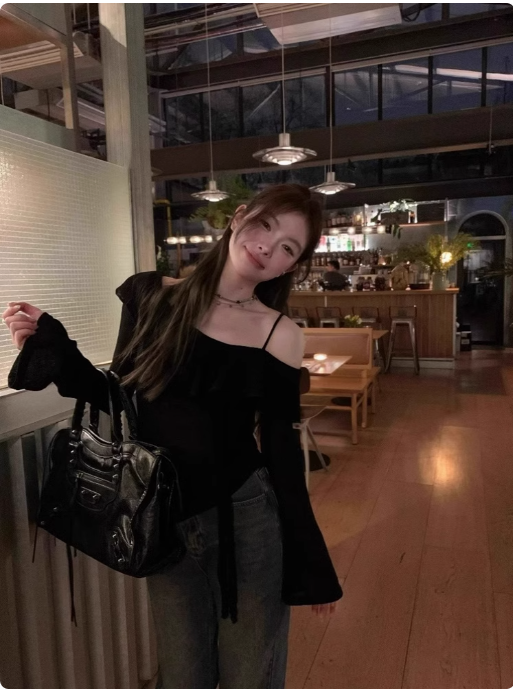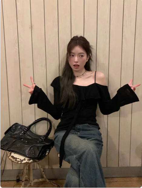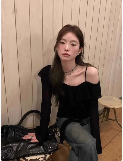 黑色一字肩長袖防曬針織衫t恤女春夏薄款設計感露肩吊帶上衣