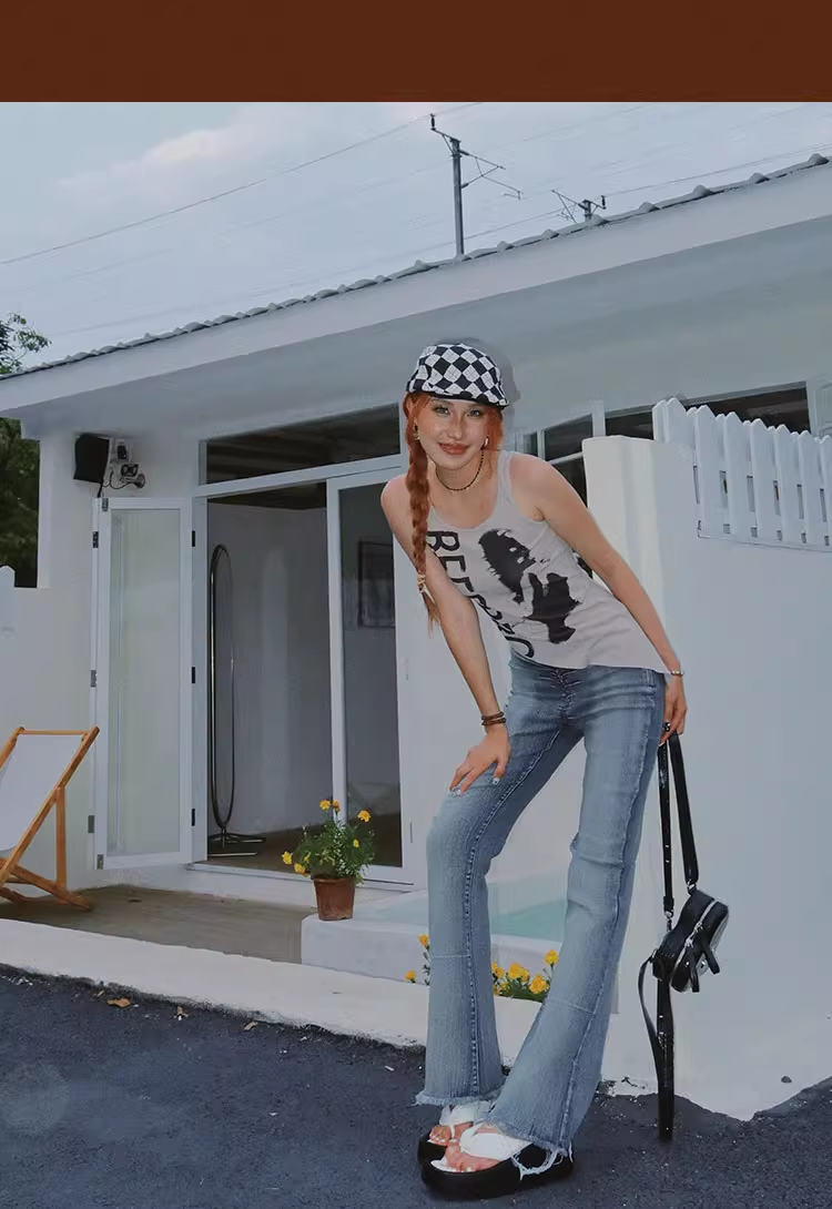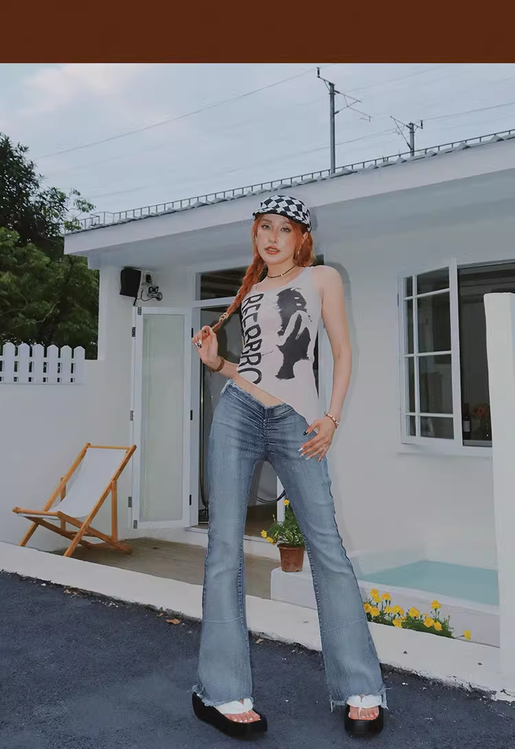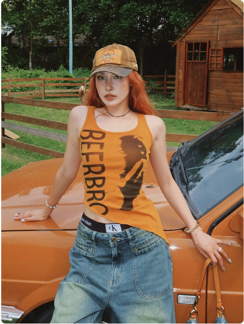 不規則下襬辣妹背心女夏季美式復古像印花無袖小上衣