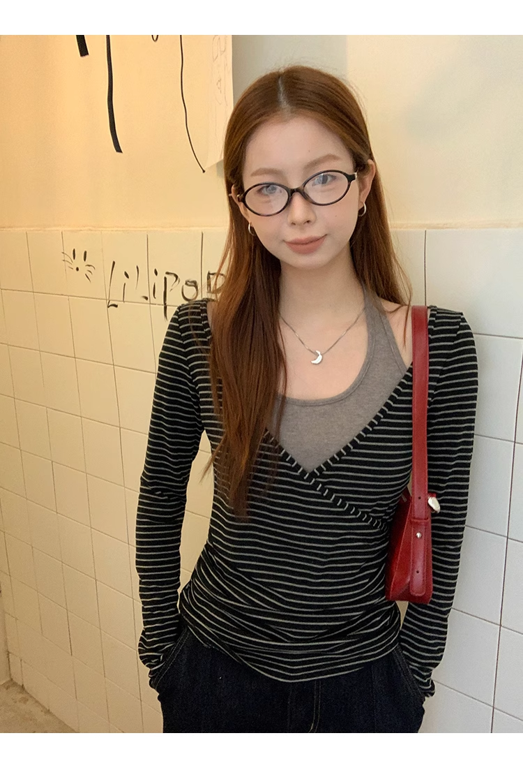 內搭打底衫女春季高級感假兩件t恤黑色長袖獨特絕美小上衣