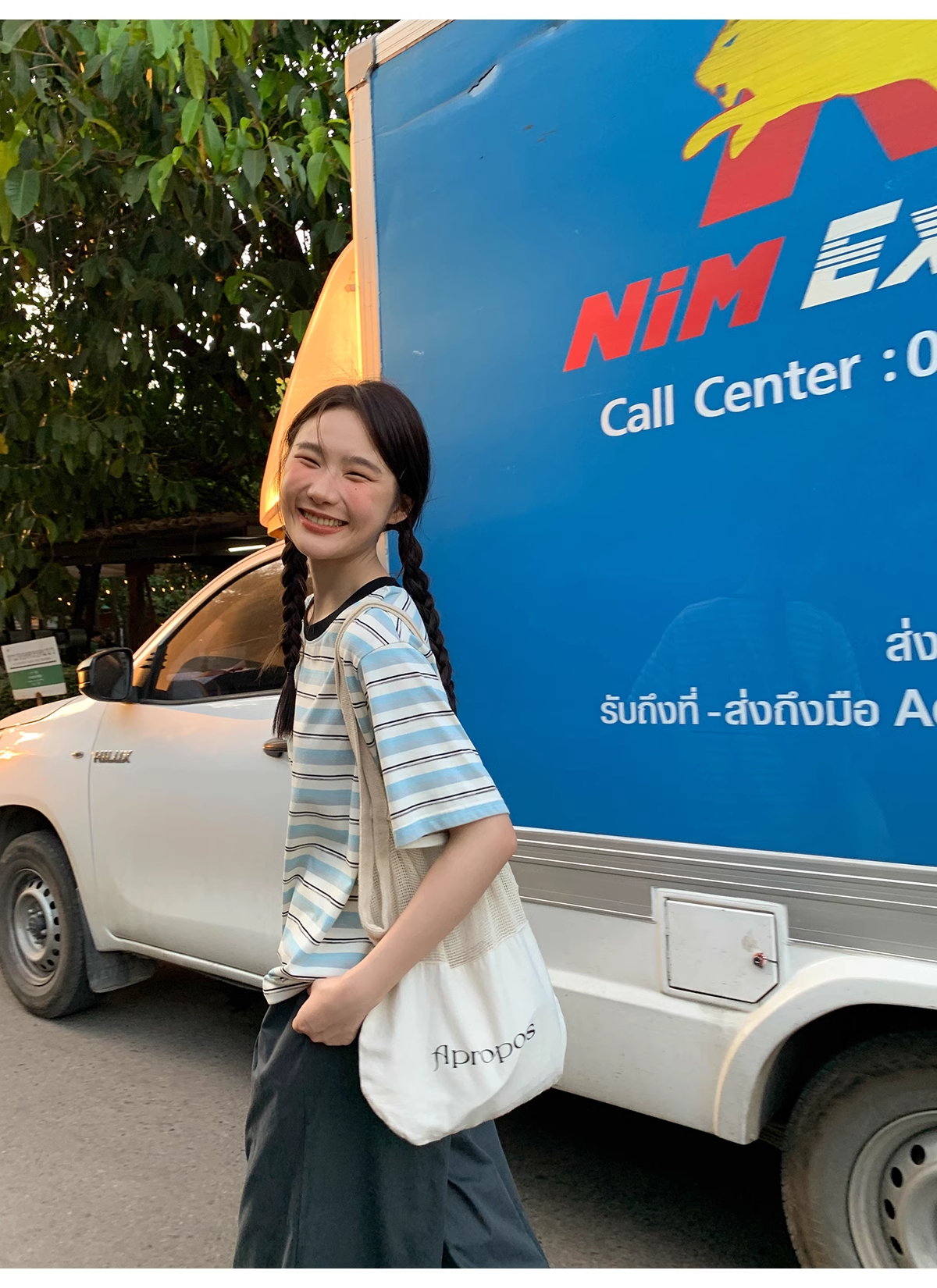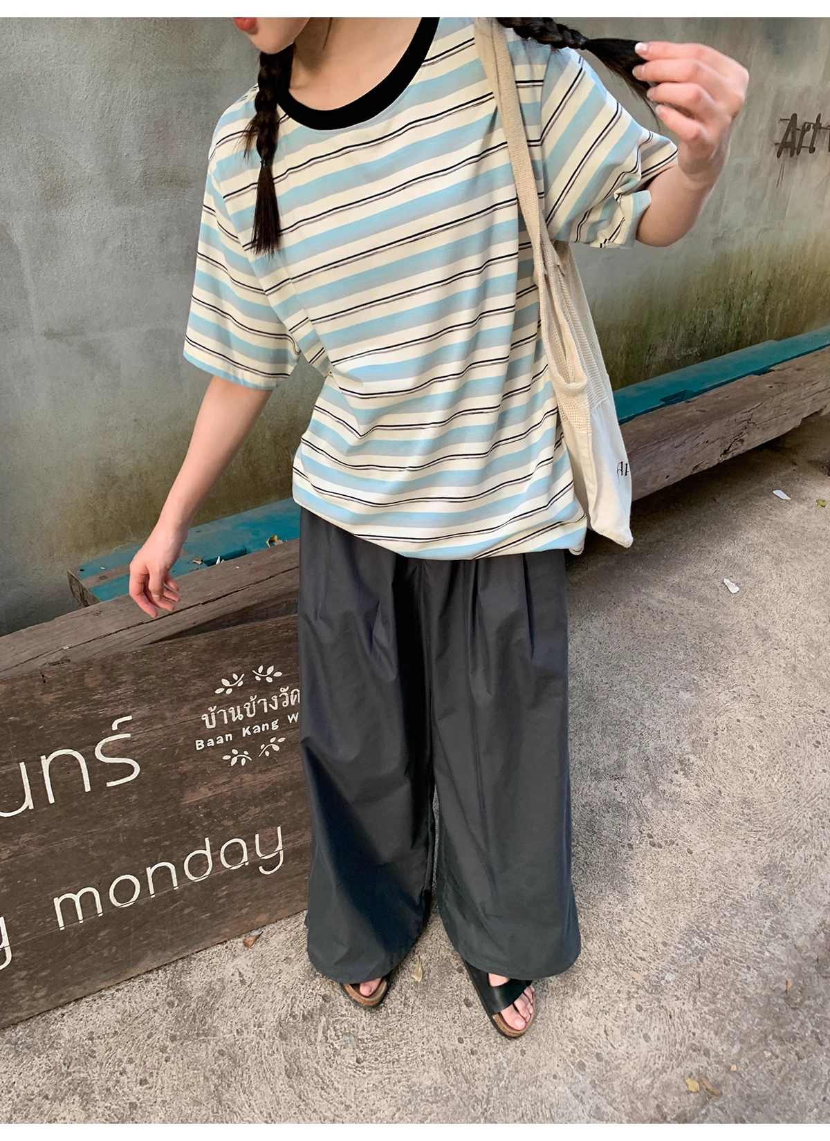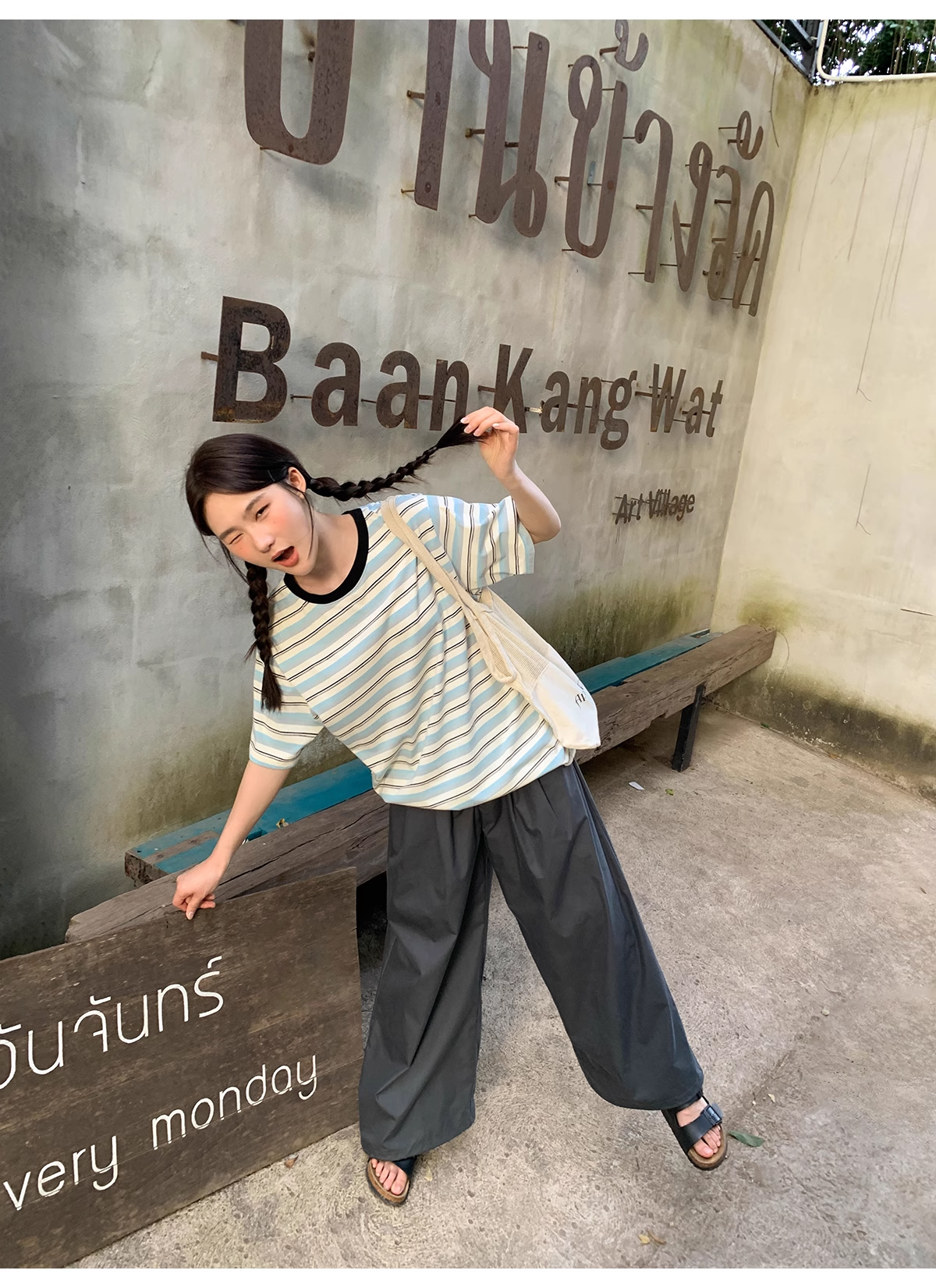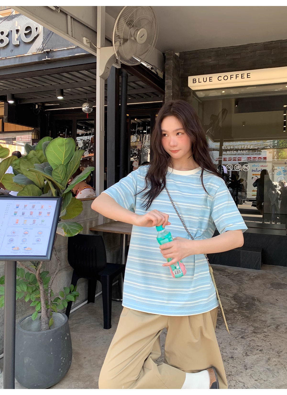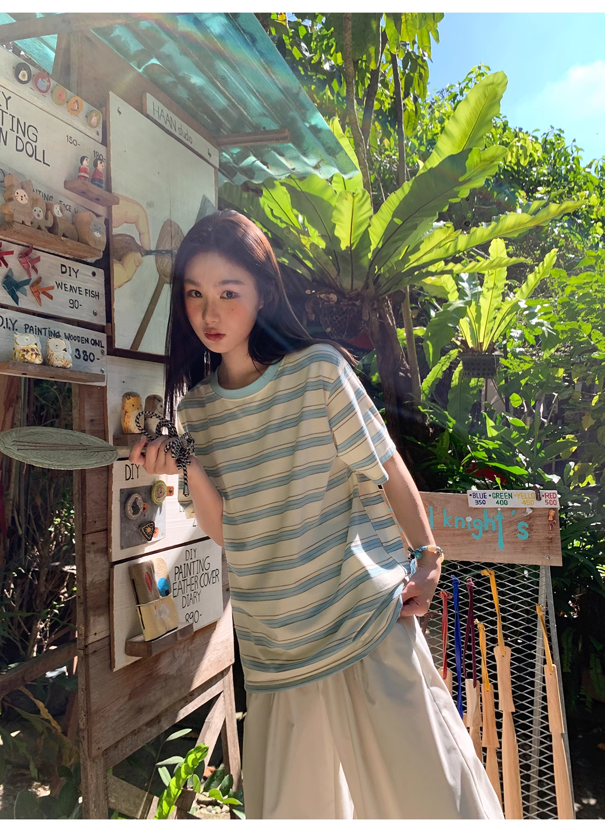 撞色條紋短袖t恤女春夏新款寬鬆顯瘦小個子圓領上衣