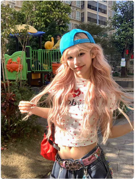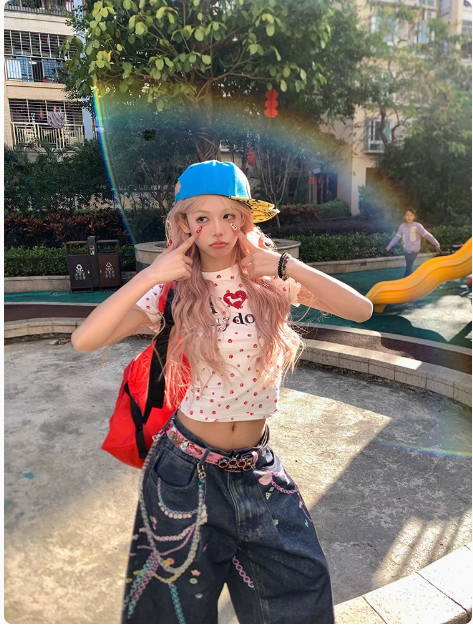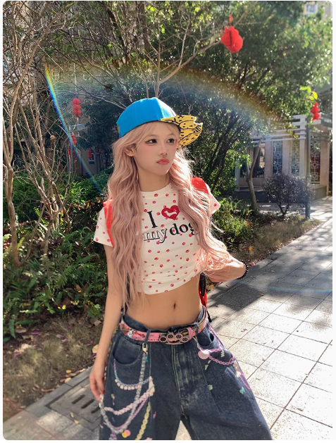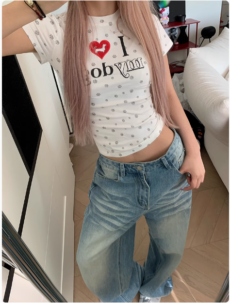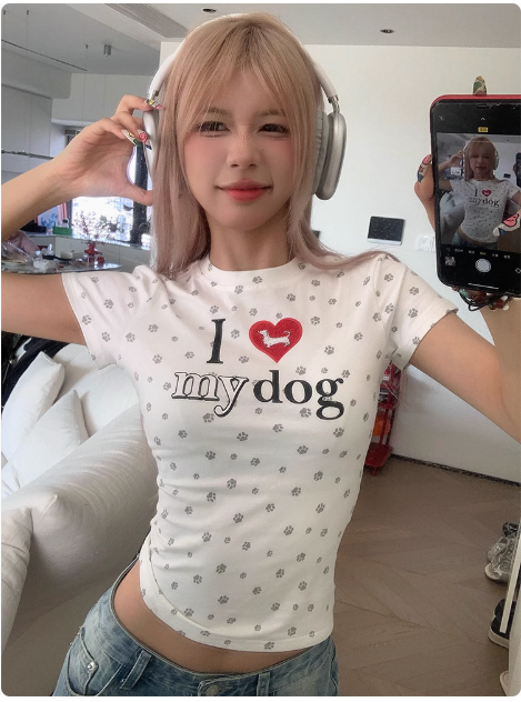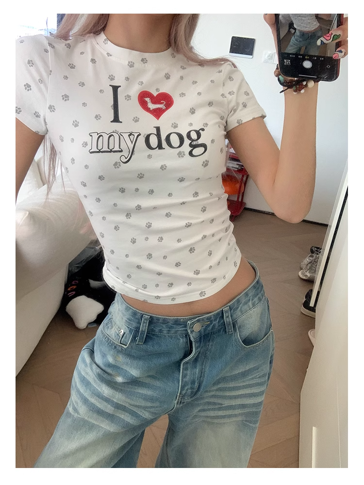 春季美式復古愛心狗爪滿印短款T恤女辣妹修身顯瘦上衣
