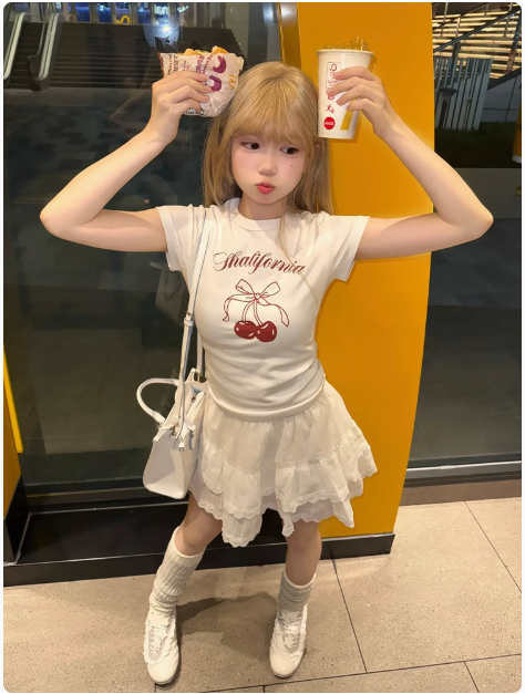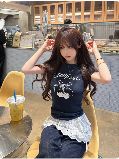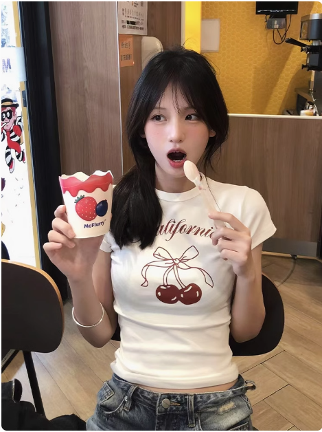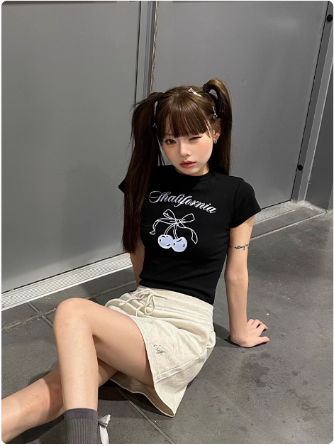 櫻桃短袖甜心短款夏季修身黑白百搭純棉正肩印花T恤