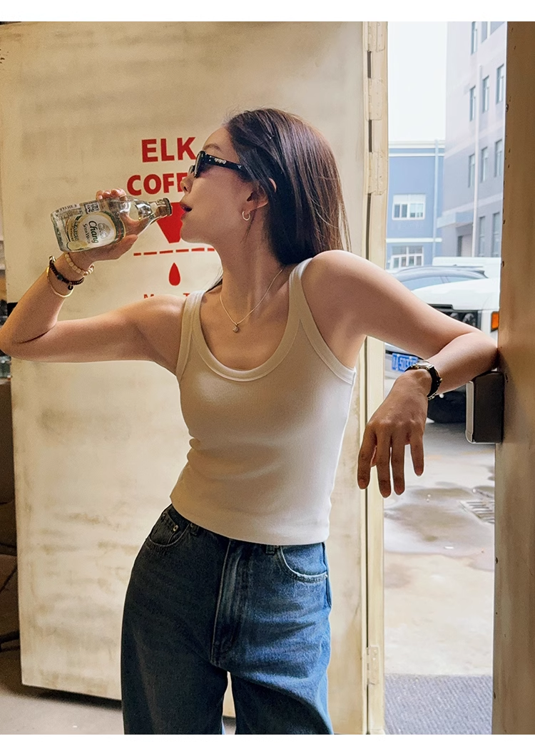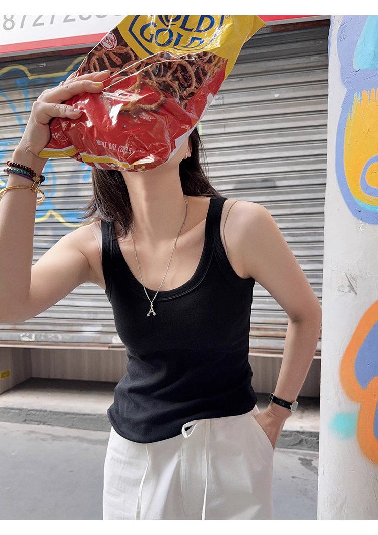 泡泡糖背心 春季新款U領坑條顯瘦內搭吊帶白色上衣女