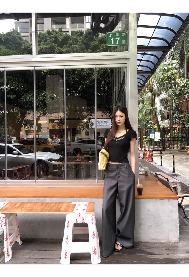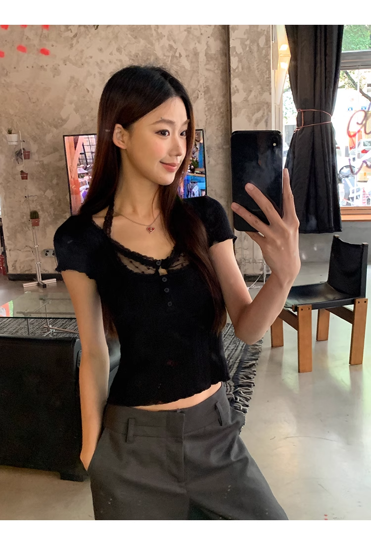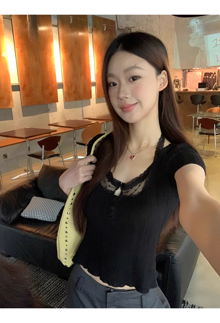短袖t恤女新款爆款夏正肩修身黑色短款獨特超好看上衣