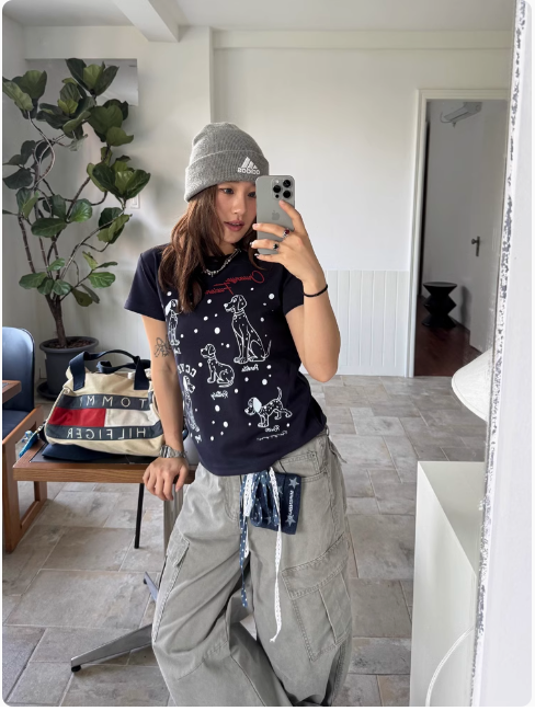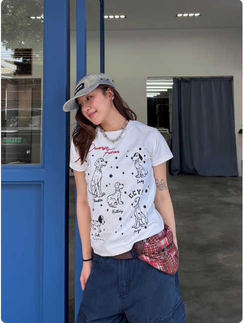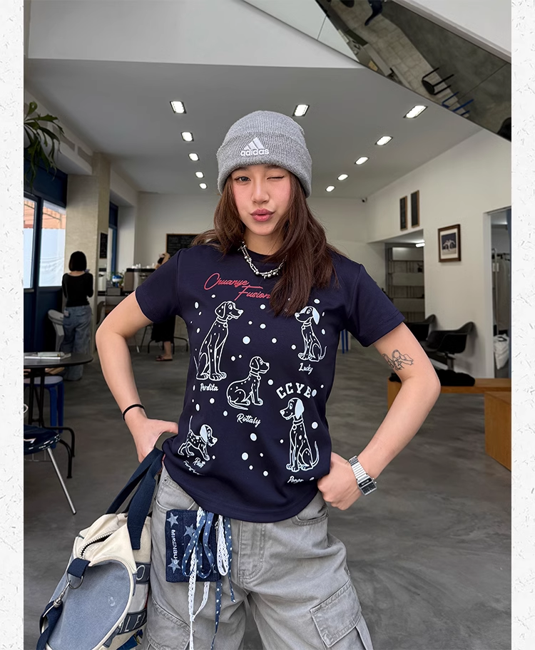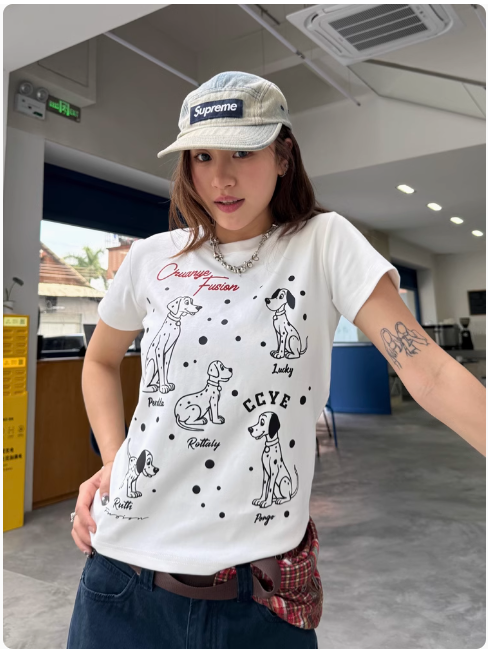美式原創斑點狗印花正肩重磅短袖T恤女夏季新款圓領上衣