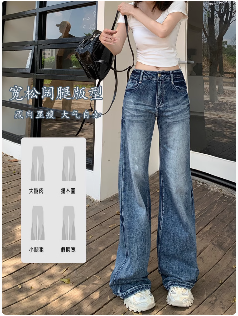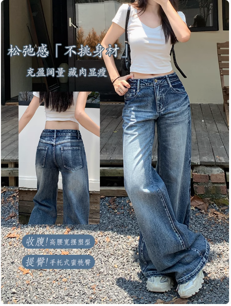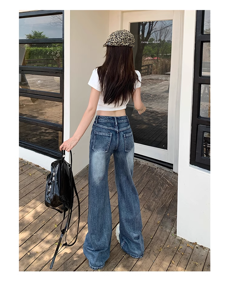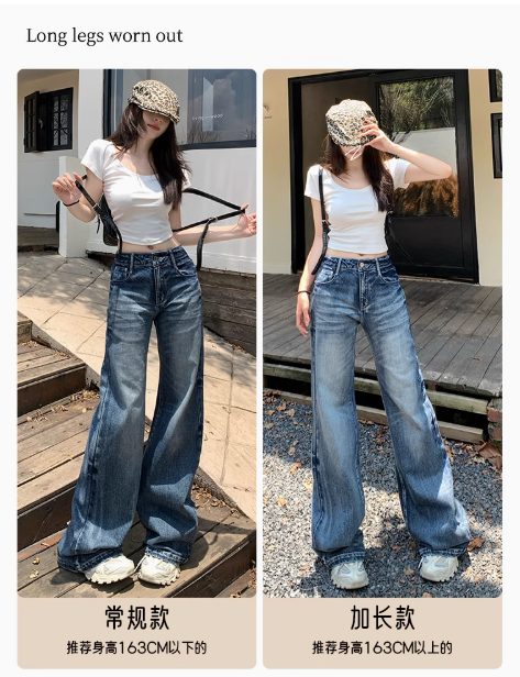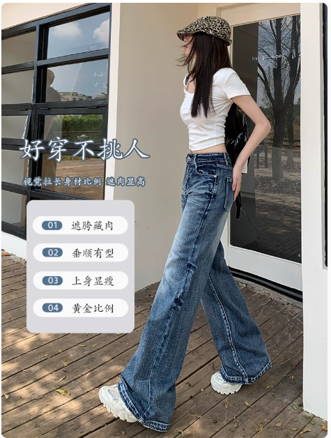 美式復古水洗闊腿微喇叭牛仔褲女春季新款低腰辣妹拖地褲子