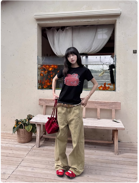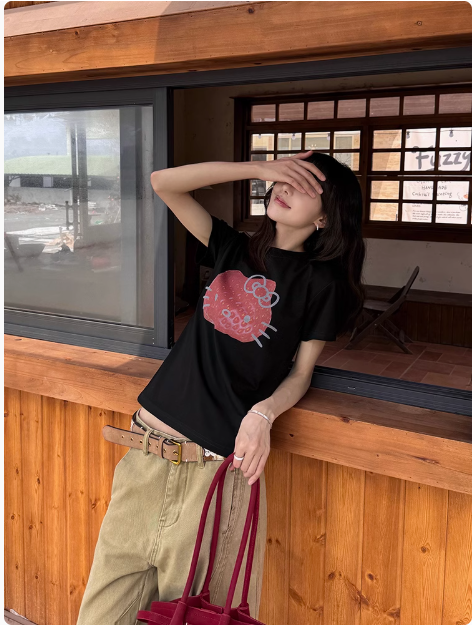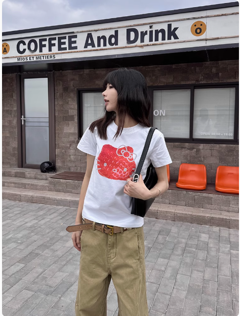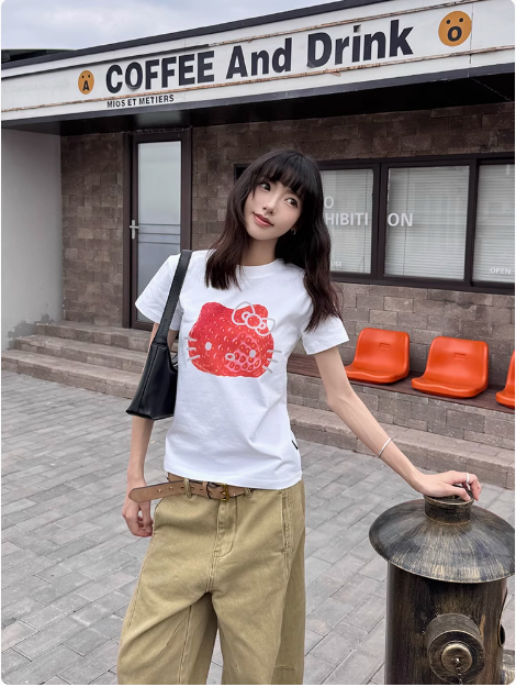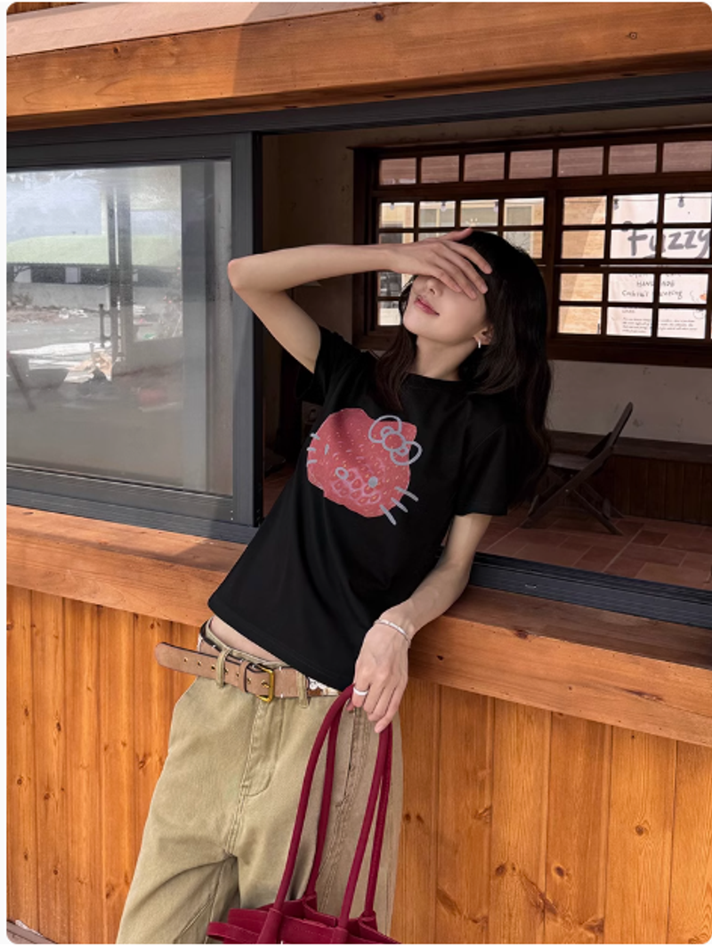 草莓kitty貓印花正肩短袖T恤女修身顯瘦上衣設計感小衆潮