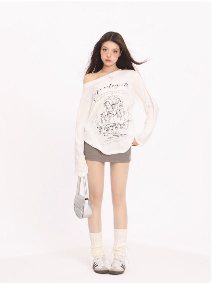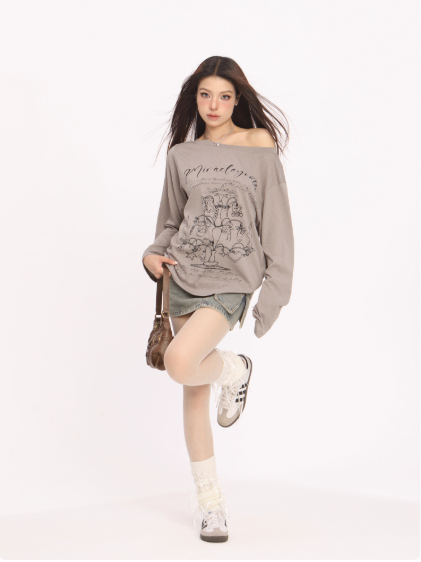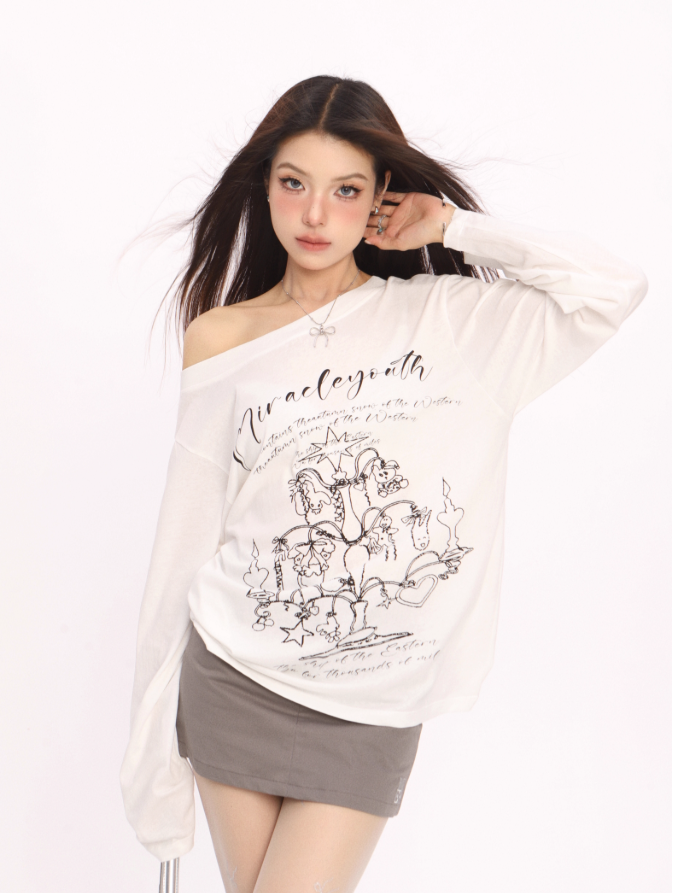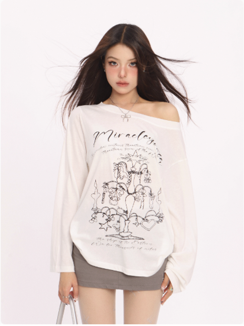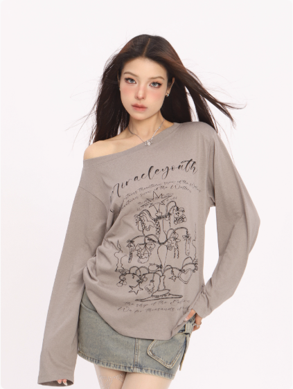 韓系塗鴉露肩T恤防曬罩衫女夏季慵懶風長袖薄款空調衫上衣