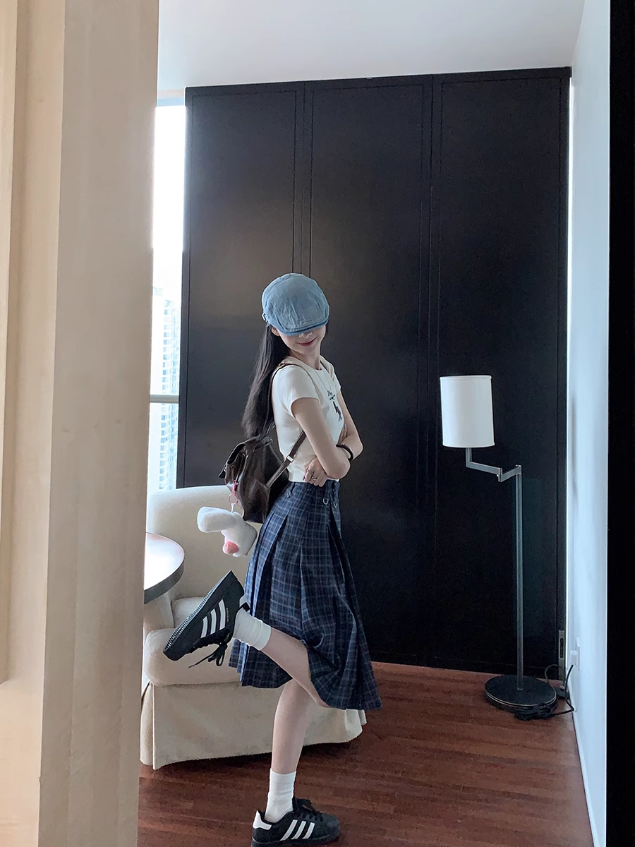 韓系學院風復古格子裙女夏季高腰中裙百褶裙A字裙藍色格紋半身裙