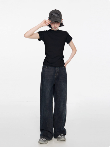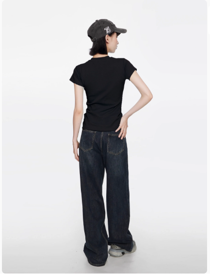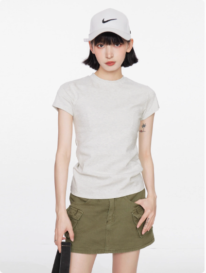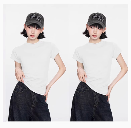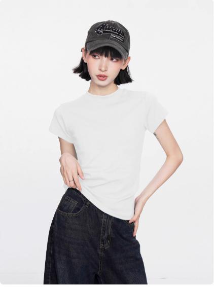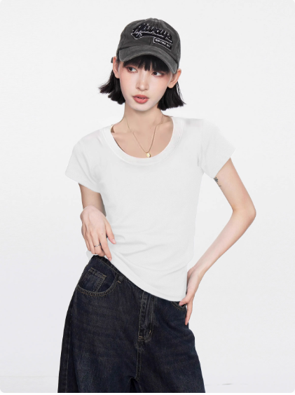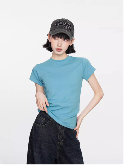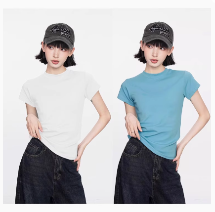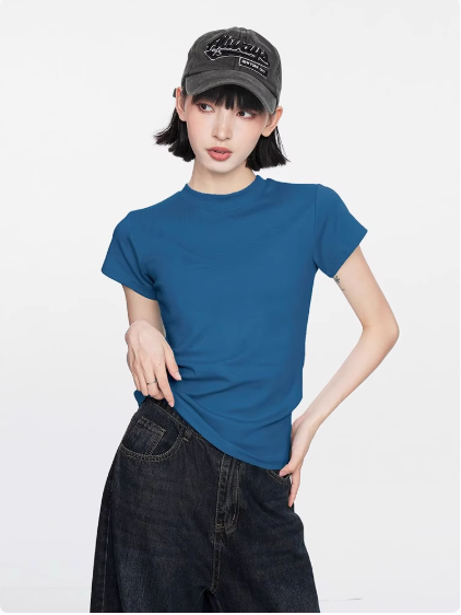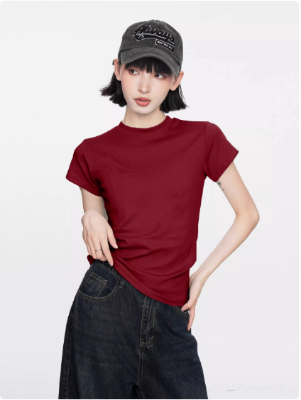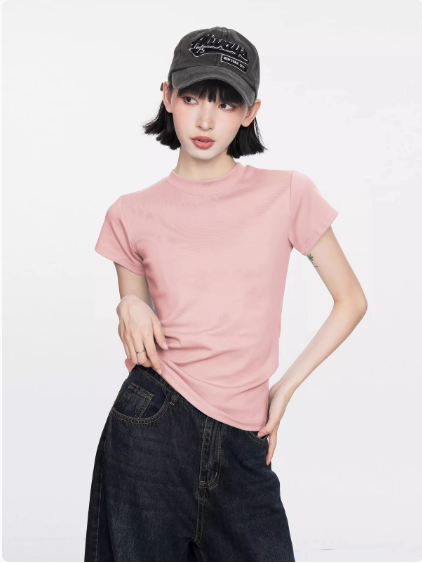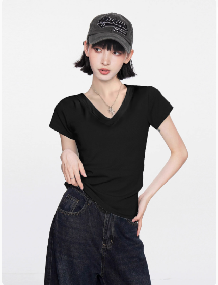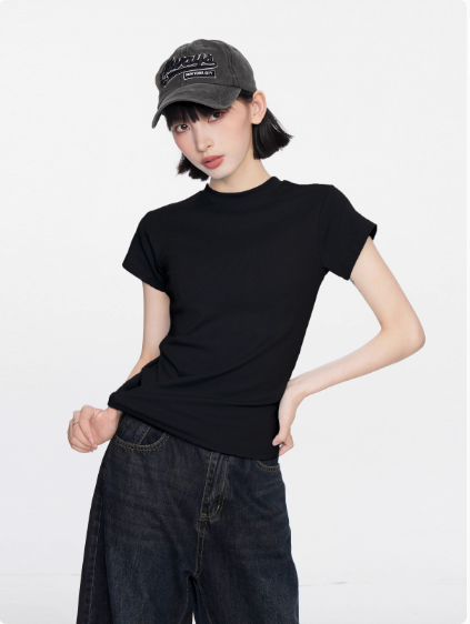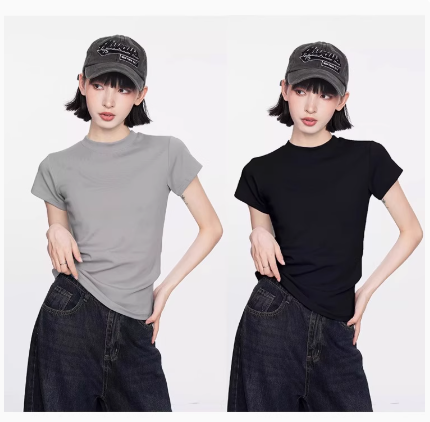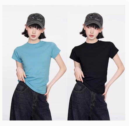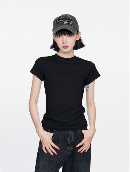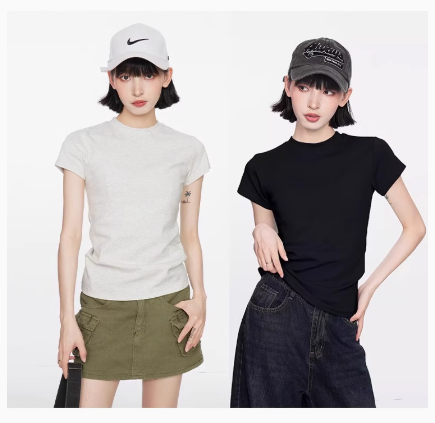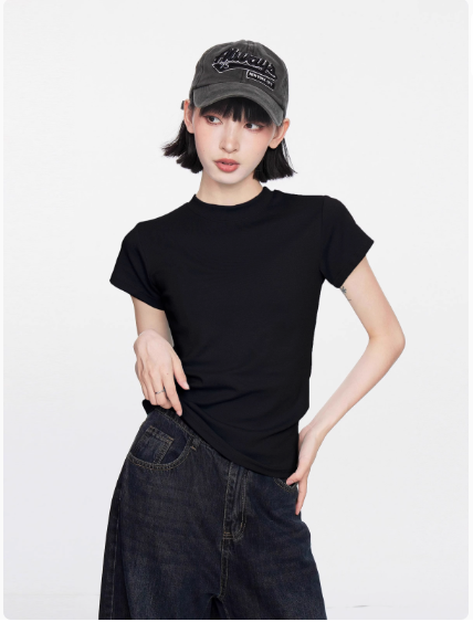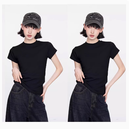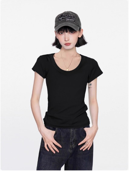 黑色正肩短袖t恤女夏新款短款修身緊身美式半袖內搭打底上衣