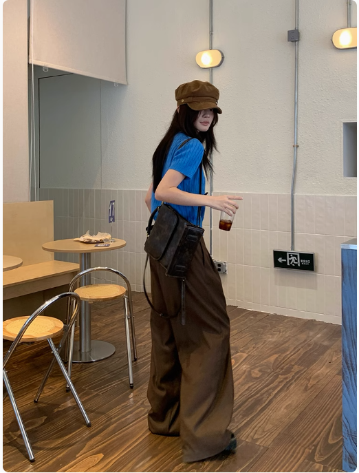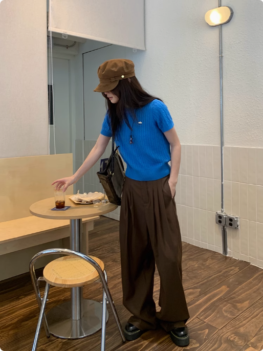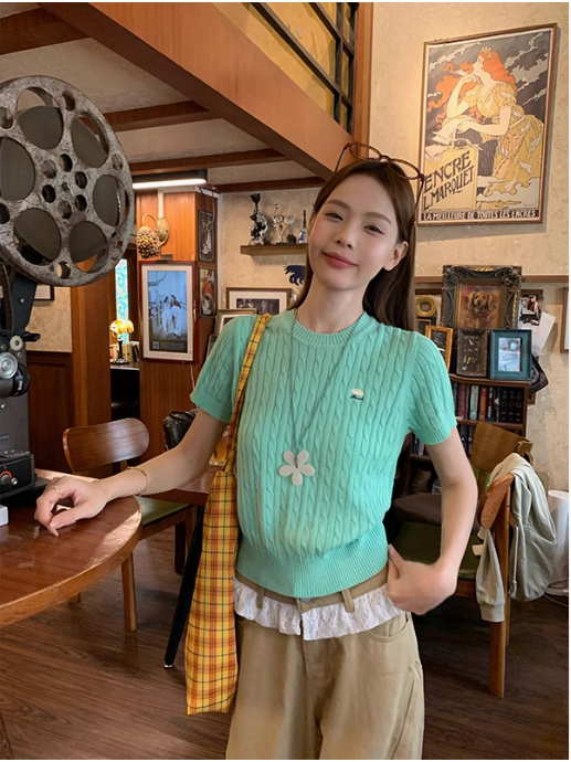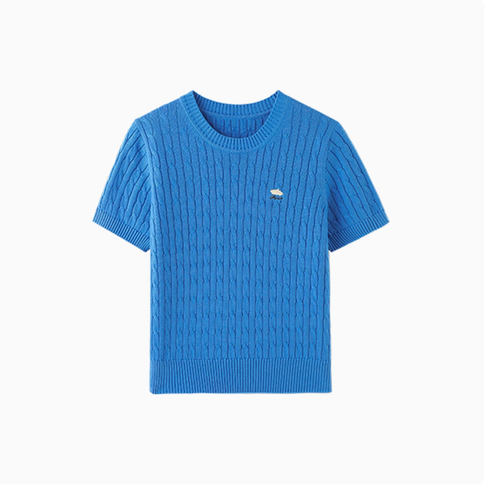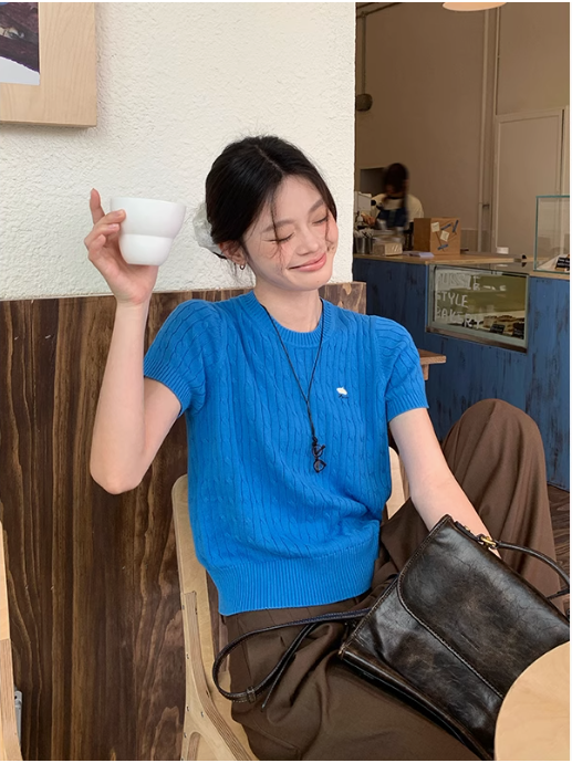 克萊因藍色針織正肩短袖t恤女夏季寬鬆繡花鬆弛慵懶感上衣