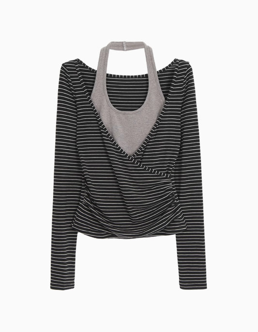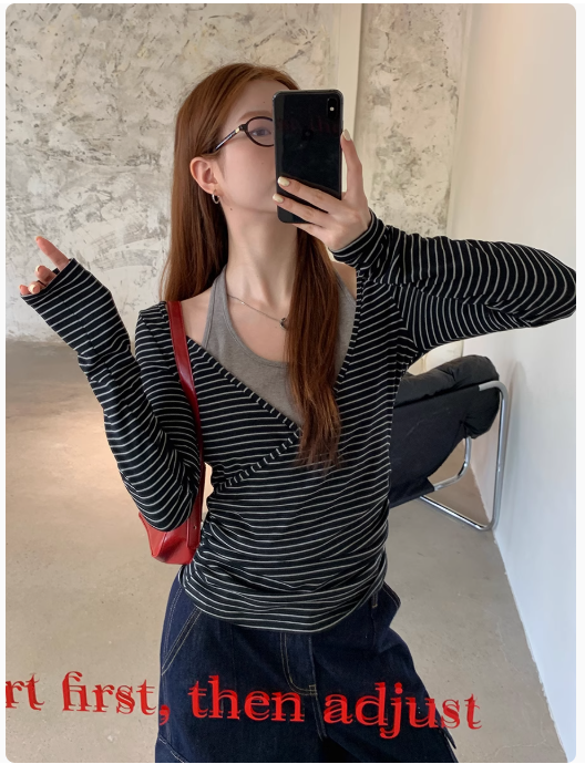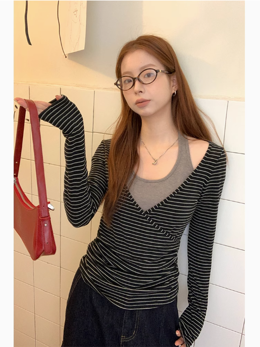 內搭打底衫女春季高級感假兩件t恤黑色長袖獨特絕美小上衣