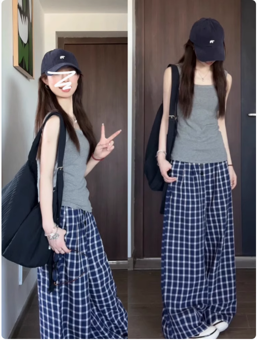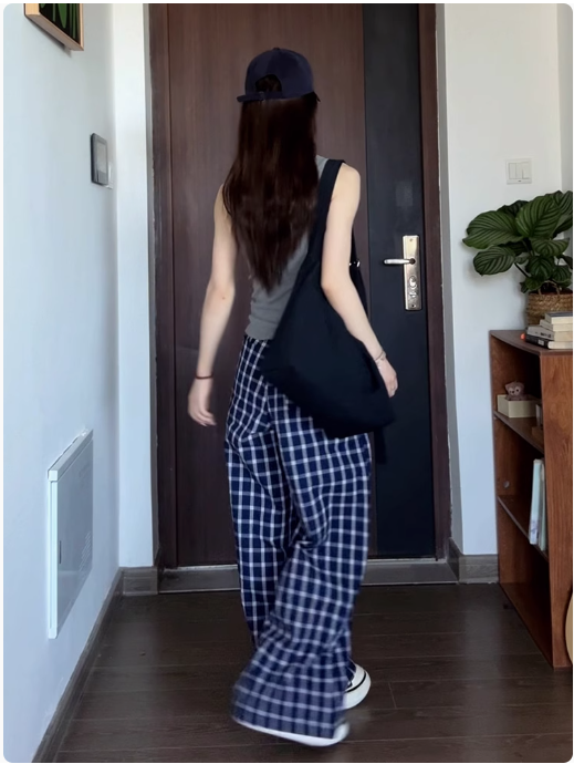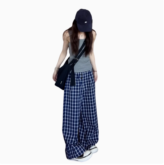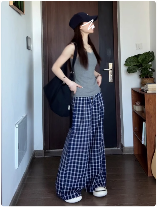 復古藍色格子休閒褲女春秋新款高腰垂感直筒拖地闊腿長褲夏季