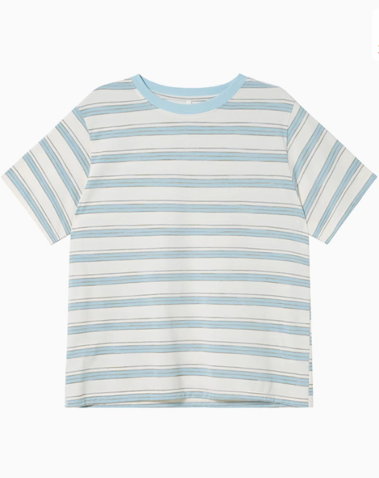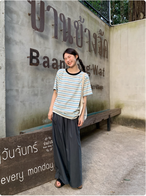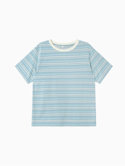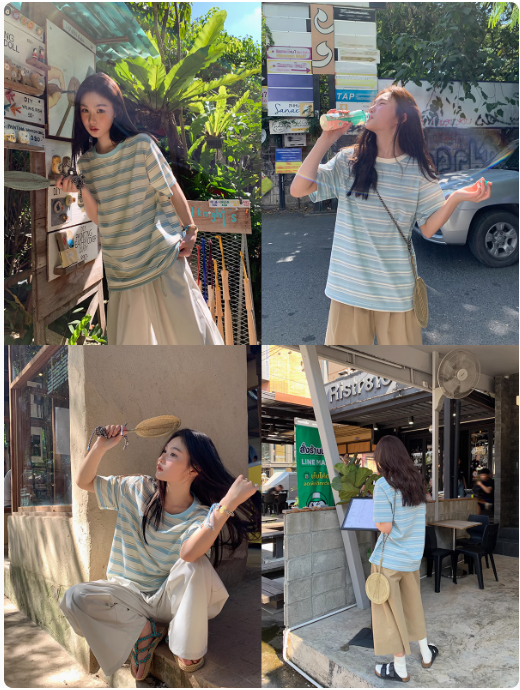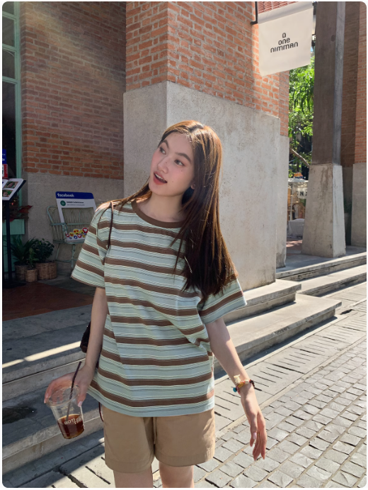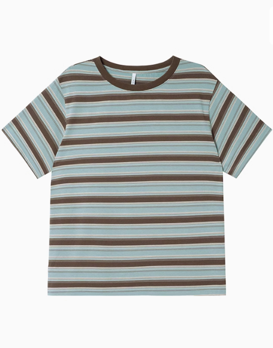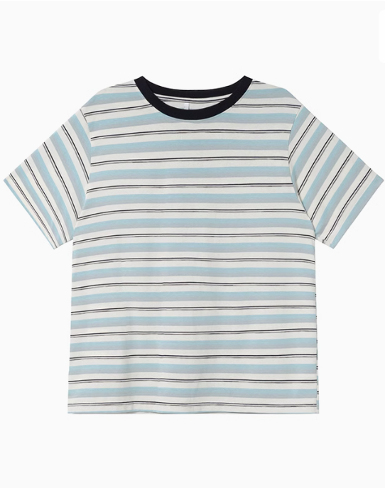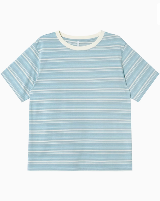 撞色條紋短袖t恤女春夏新款寬鬆顯瘦小個子圓領上衣