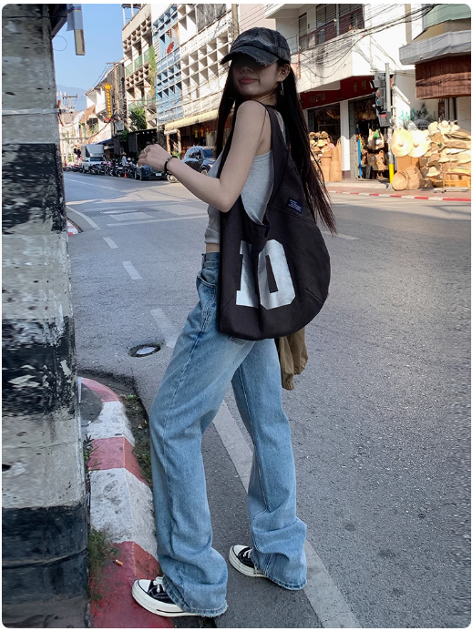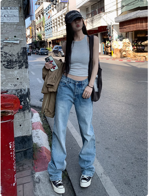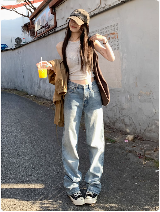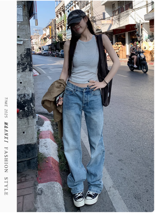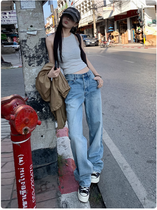 淺藍色直筒牛仔褲女春夏新款美式辣妹顯瘦百搭窄版寬鬆褲子