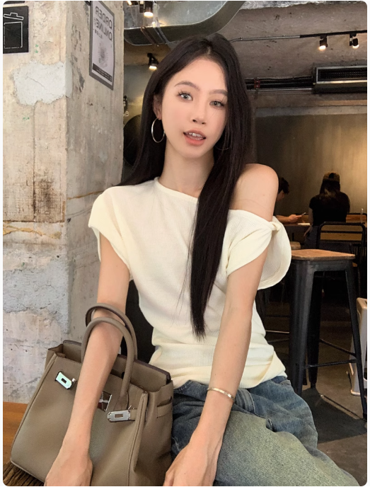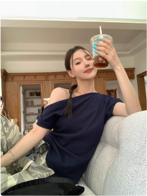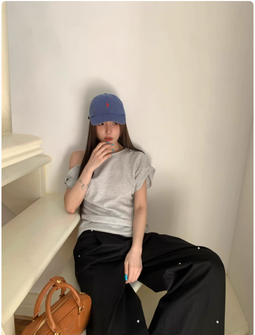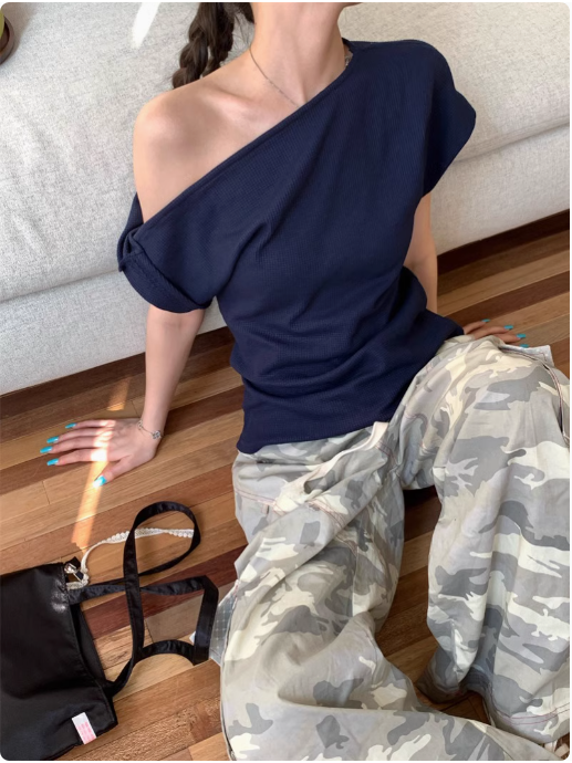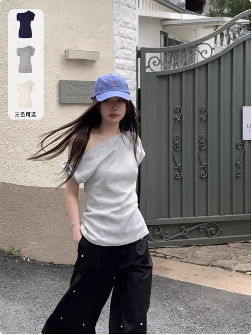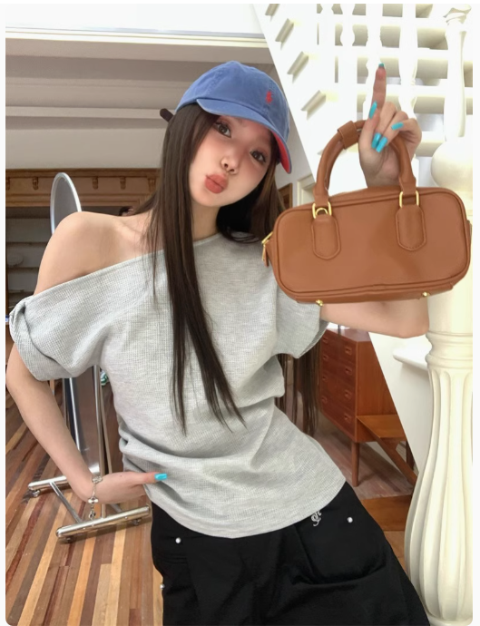 灰色斜領露肩短袖華夫格T恤女夏季鬆弛感慵懶休閒設計感寬鬆上衣