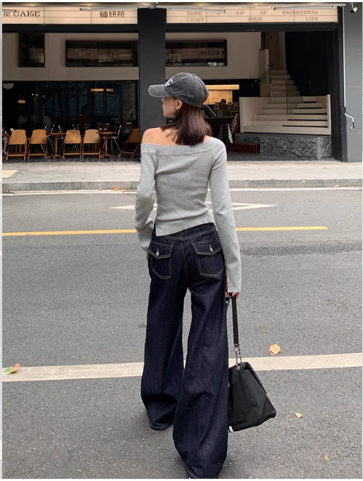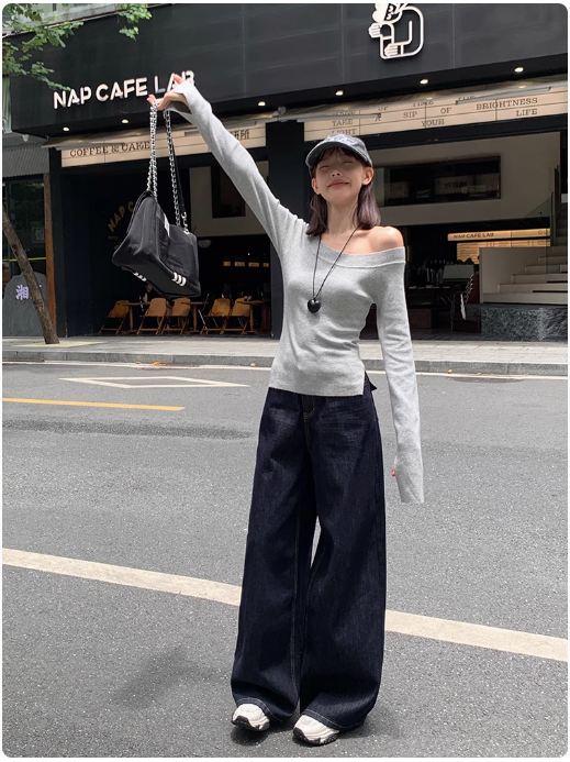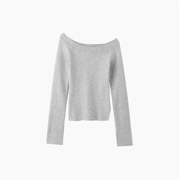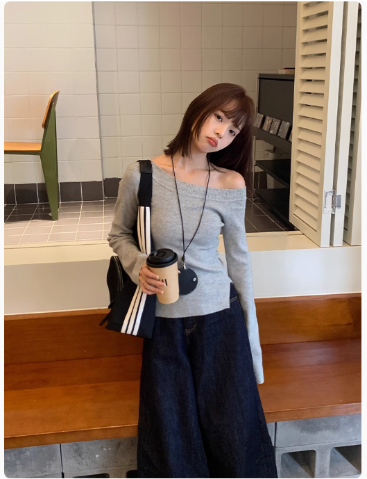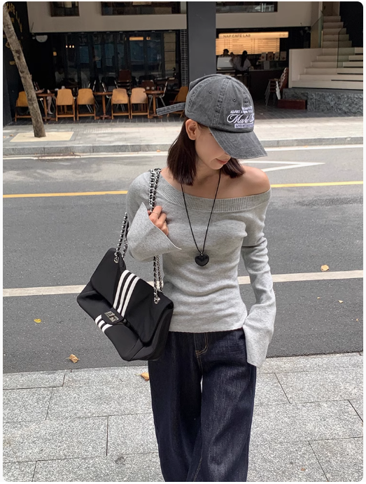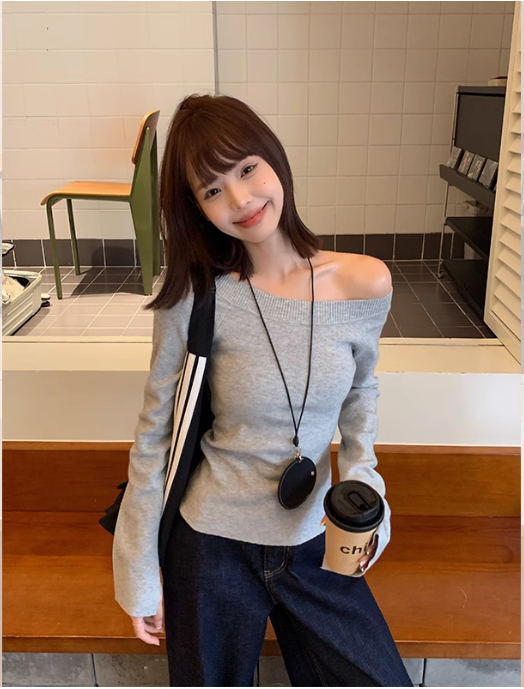 灰色露肩斜肩針織衫女春季修身顯瘦長袖t恤辣妹上衣潮
