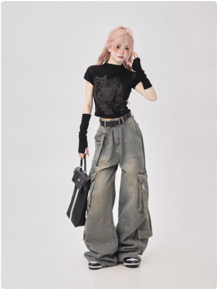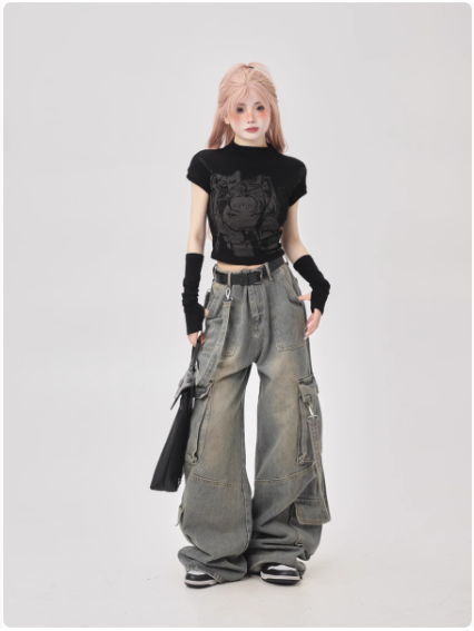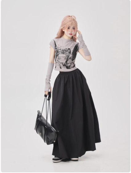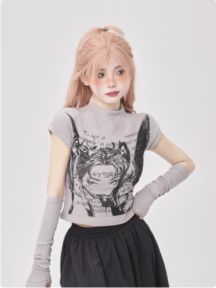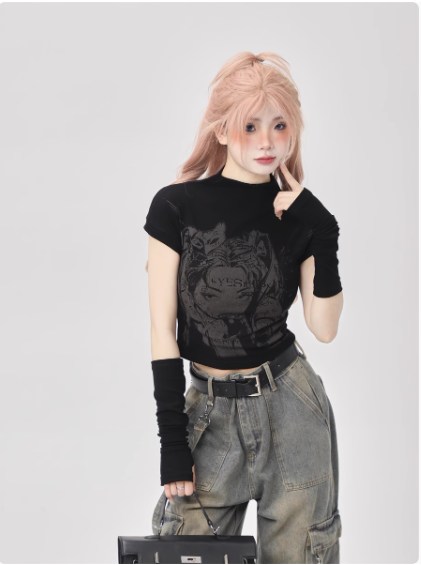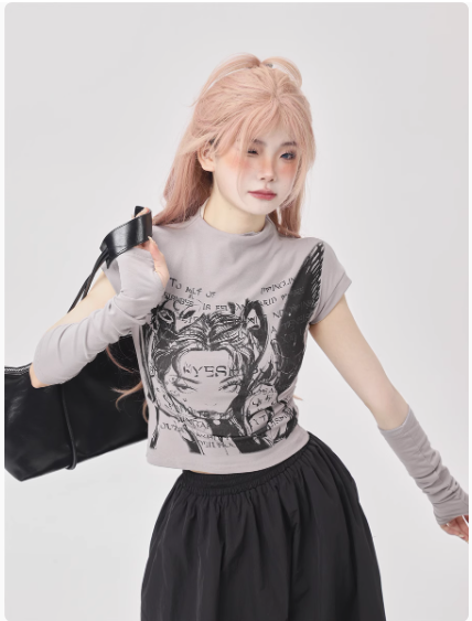 機能風辣妹卡通兩件套短袖t恤女夏季袖套設計感小衆別緻正肩上衣